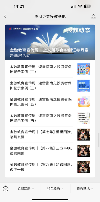 为提升公众金融素养,构建安全金融环境,帮助广大群众提升识别和防范非法证券期货活动的能力,华创证券投教基地从投资者实际需求出发、结合市场热点,制作通俗有趣、形式广受欢迎的原创投教产品进行宣传。本次活动期间,共制作投放投教产品46个,阅读量达16083612人次。其中,制作投放原创投教产品16个,阅读量达8411357人次;转载非原创投教产品30个,阅读量达7672255人次。